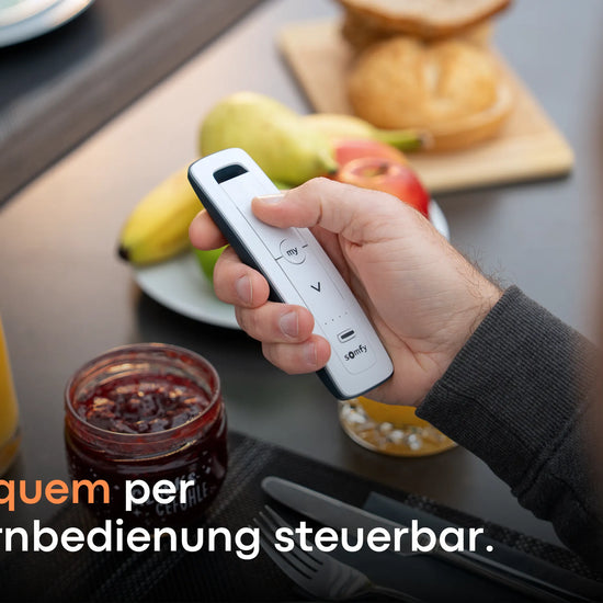 Für besonders hohen Bedienkomfort eignet sich ein Funkmotor mit Fernbedienung. Hier genügt ein normaler 230-Volt-Stromanschluss. Diese Lösung ist besonders praktisch bei mehreren Markisen, denn mit einer Mehrkanal-Fernbedienung können Sie jede Markise einzeln oder alle gemeinsam steuern. Mit der passenden Steuerung, zum Beispiel Somfy TaHoma, ist auch eine Bedienung per Smartphone oder Tablet möglich.