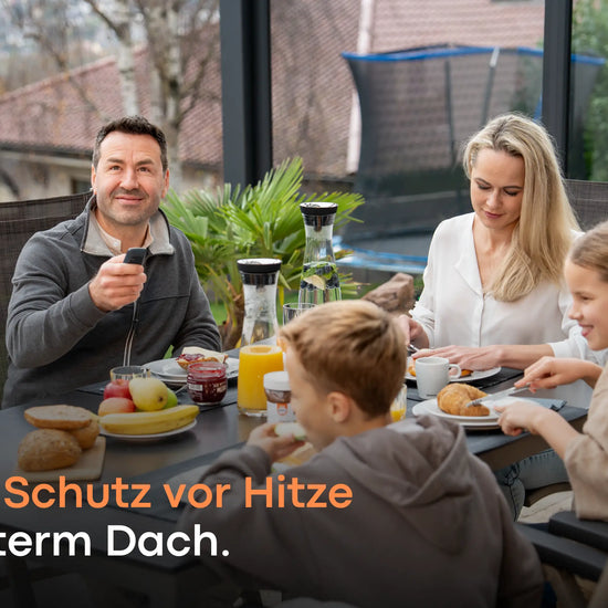 Erleben Sie entspannte Sommertage auf Ihrer Terrasse, auch bei intensiver Sonne. Die Überdachmarkise senkt die Temperatur unter dem Glas deutlich und schafft ein angenehmes Klima zum Entspannen. So wird Ihre Terrasse zum perfekten Platz für Ruhe und Erholung.